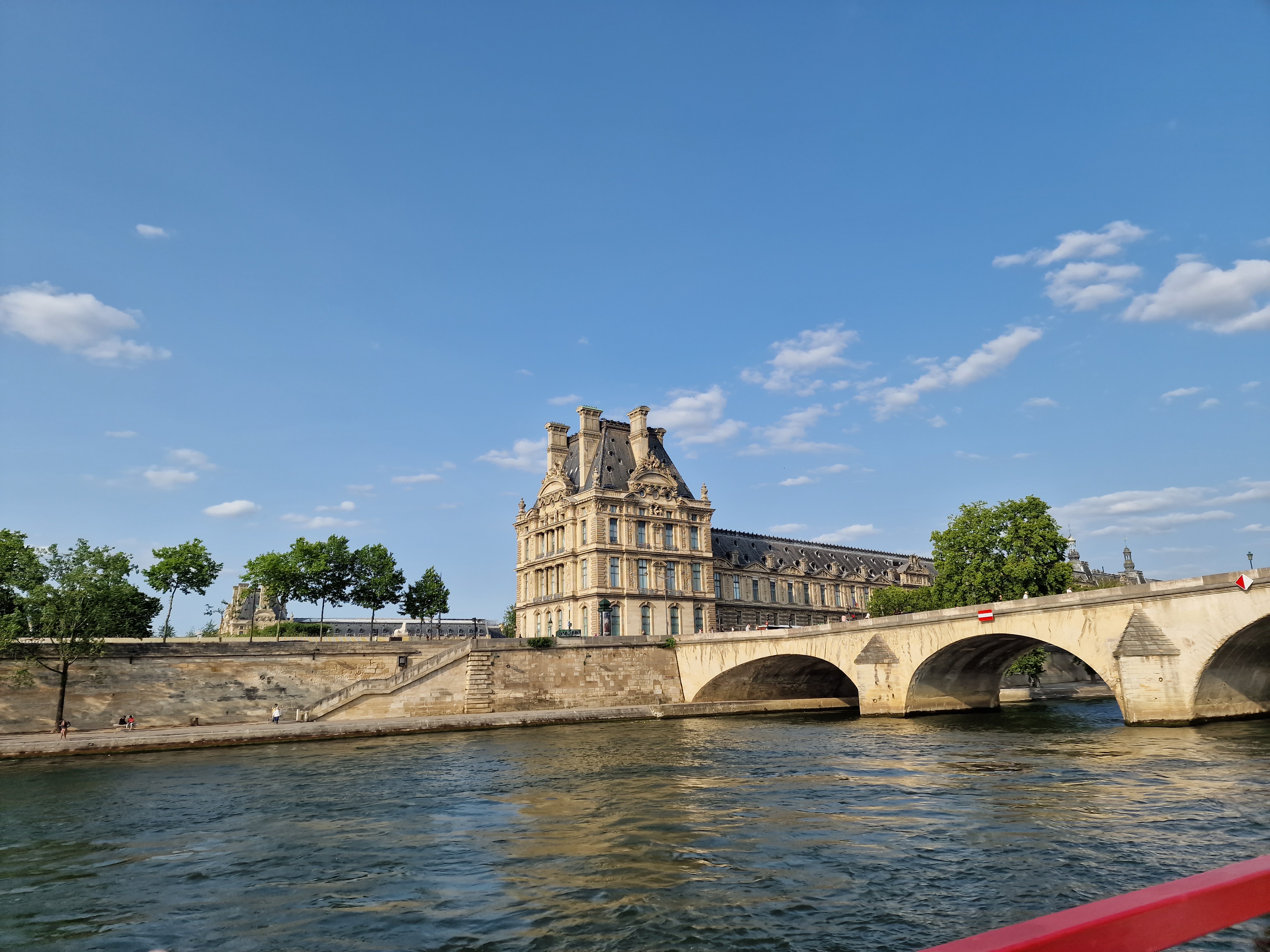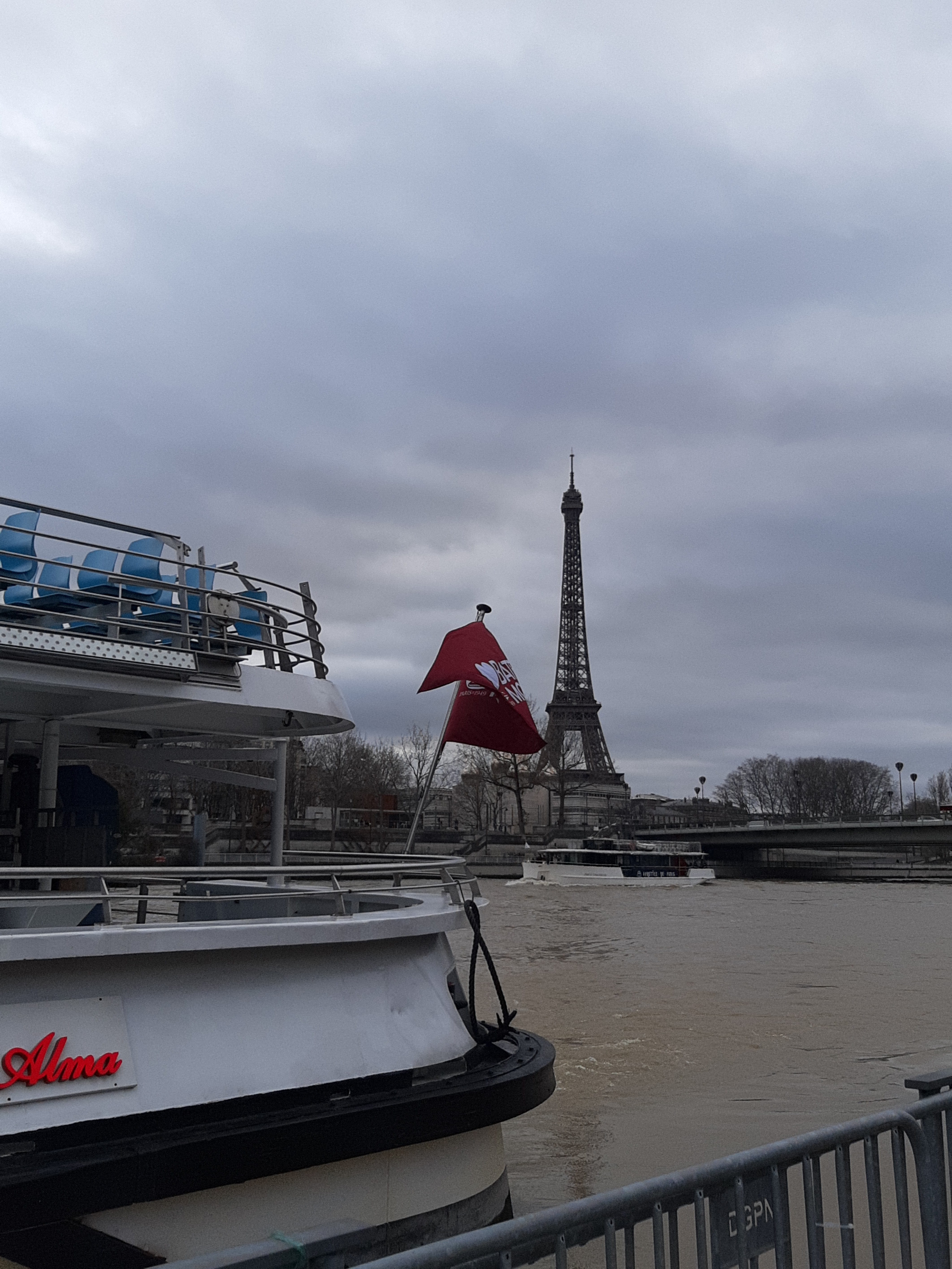Superbe croisière en bateau-mouche ! On a pu y contempler les célèbres monuments de Paris à travers un parcours de 15km sur la Seine. Environ 1h10 de croisière afin de découvrir les principaux grands œuvres architecturaux de la capitale à savoir le pont de l'Alma, Tour Eiffel, Trocadéro, Louvre, Cathédrale Notre-Dame, Conciergerie, Musée d’Orsay, Pont-Neuf, les Invalides, pont Alexandre III et la passerelle des Arts, pont neuf qui est le plus vieux pont à Paris ainsi que le pont du Carrousel et le pont Royal etc. A prévoir des vêtements chauds si vous vous installez tout en haut.