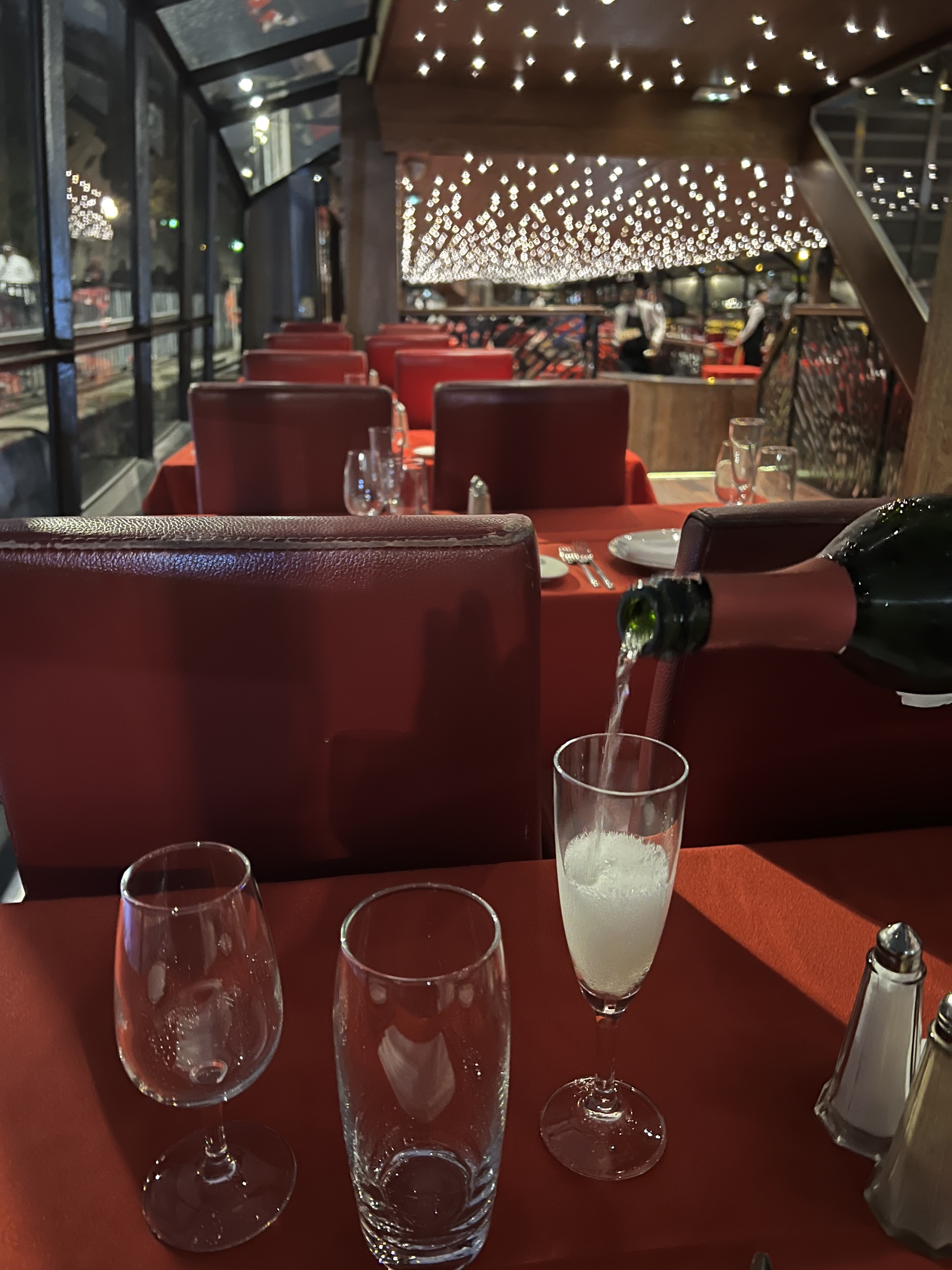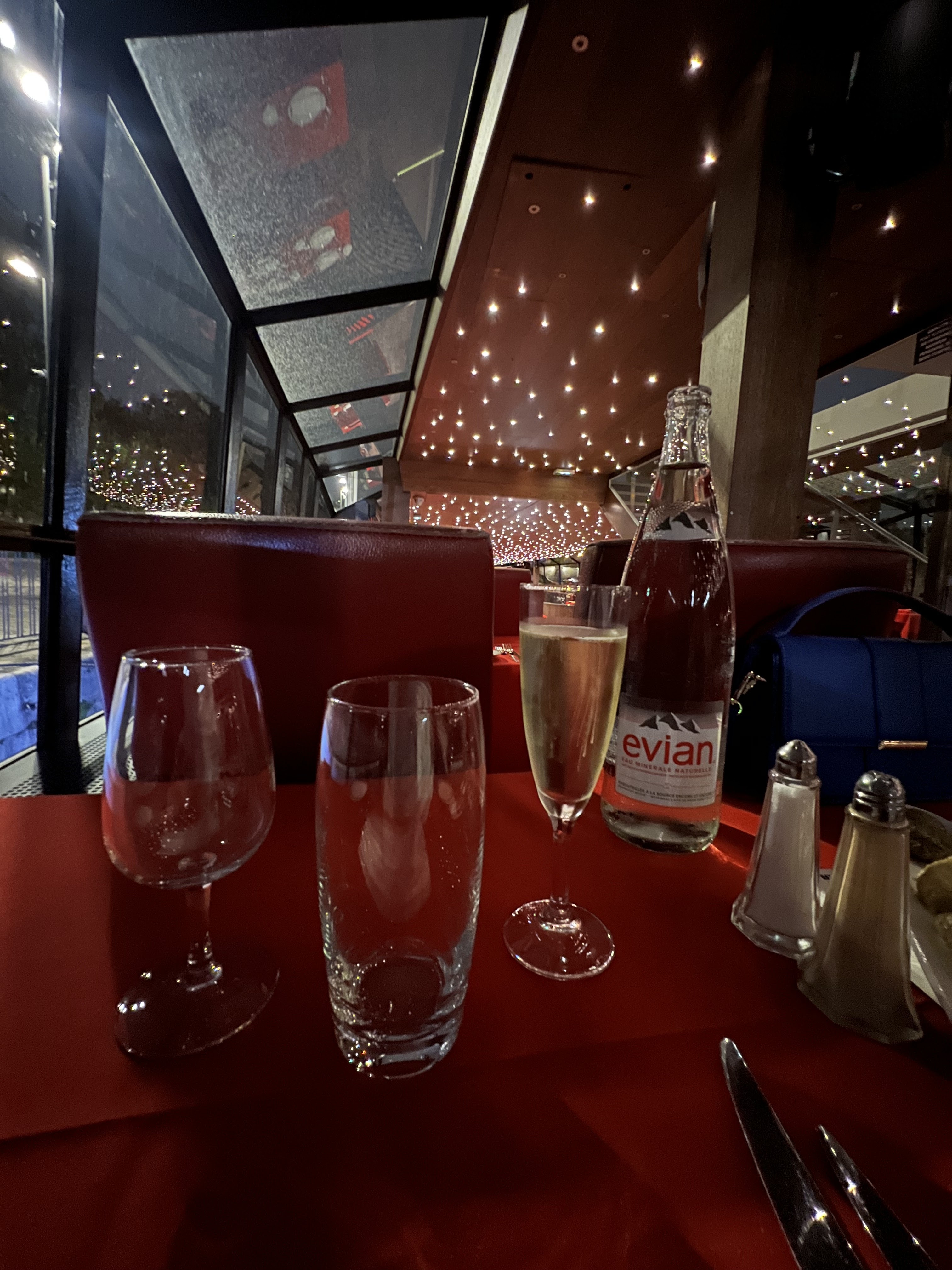 Accueil extra. Repas excellent. Equipe professionnelle et très sympathique. Ambiance piano/violon au top. Et une vitesse de croisière qui laisse le temps d'apprécier les lumières de la ville. Parfait.