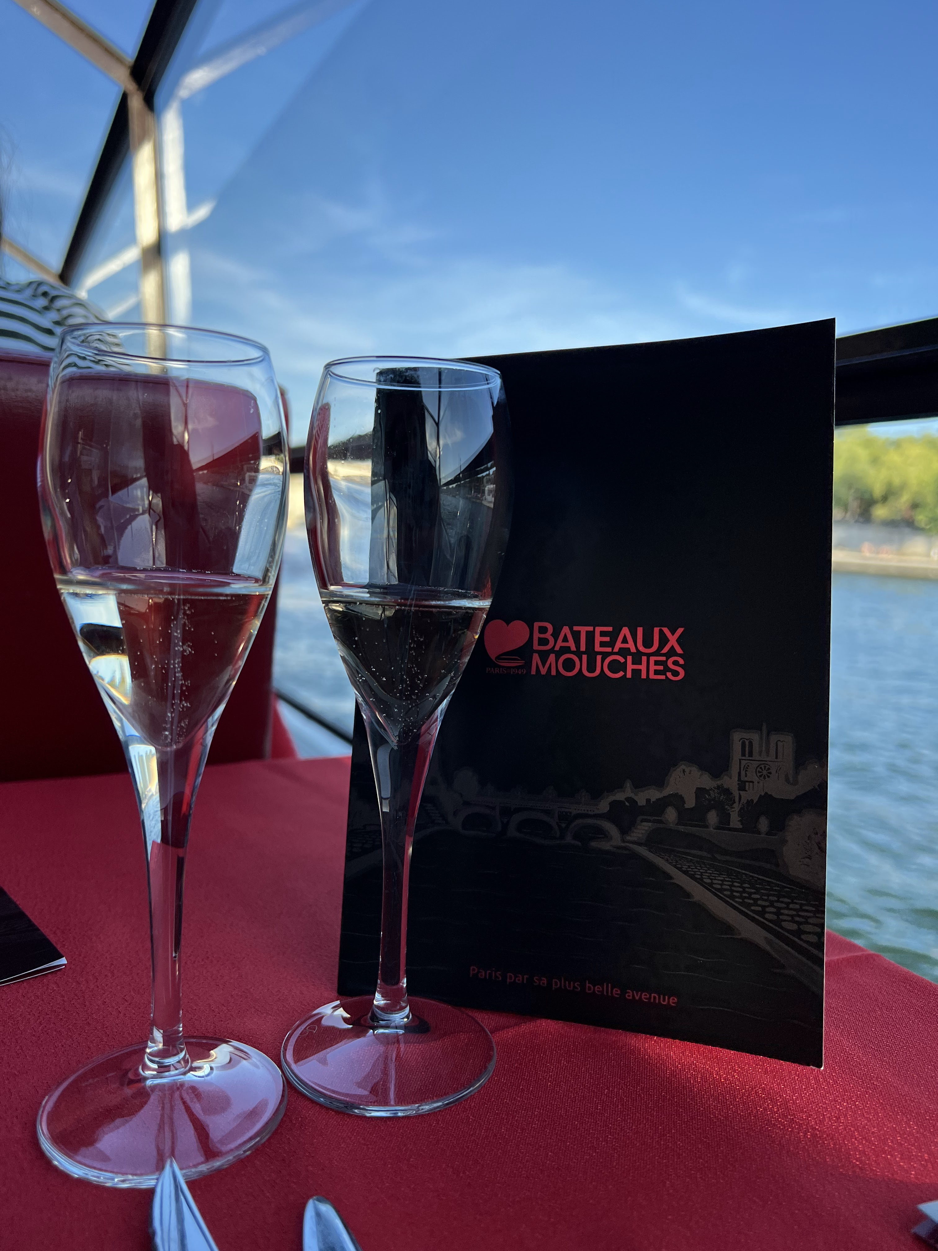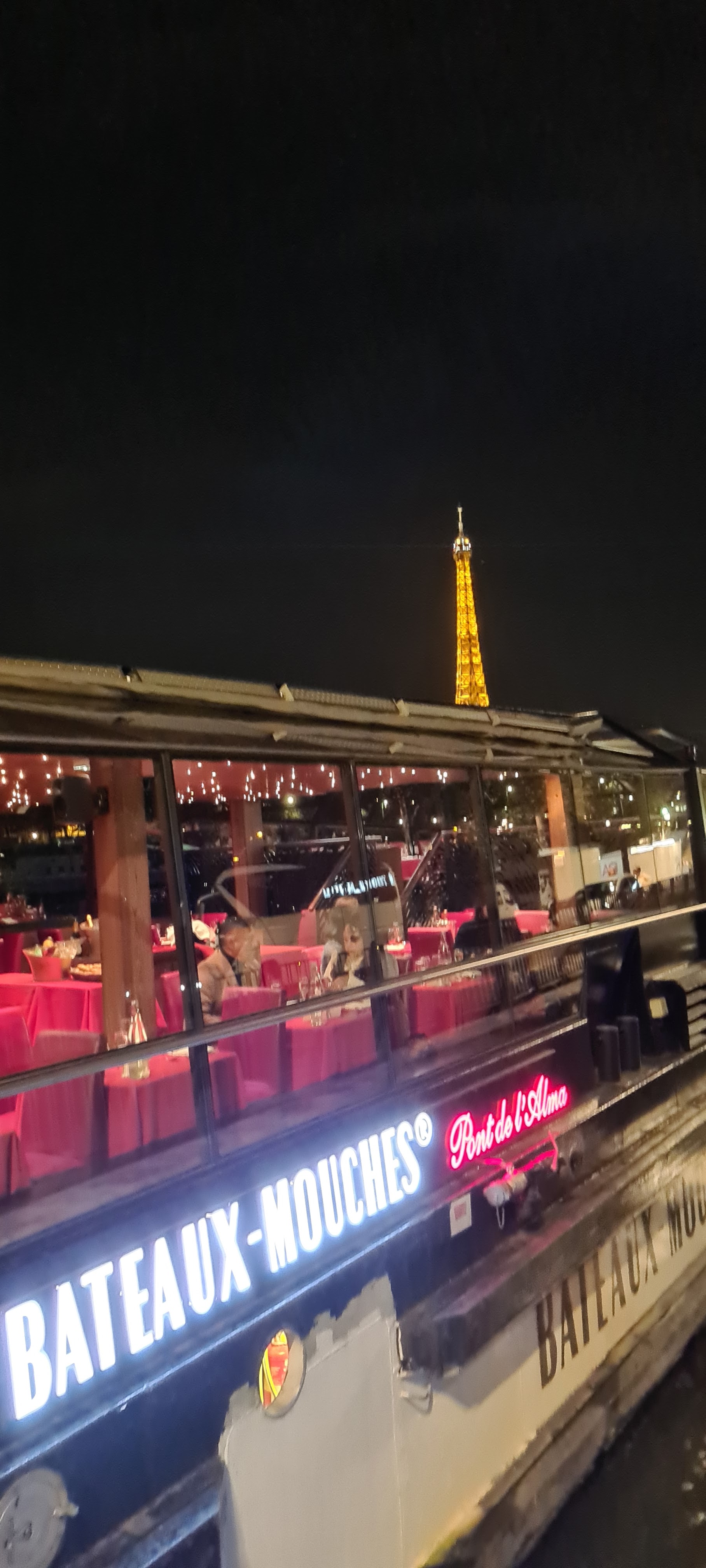 Nous avons réservé une soirée avec repas sur les bateaux-mouches et nous avons trouvé facilement l’emplacement puisque l’embarquement se fait juste à côté du pont de l’ Alma. Vous pouvez vous faire déposer par taxi et VTC juste devant l’embarcadère où l’on vous remettra les Menus et le trajet effectué pour la soirée. Ensuite on vous donne le nom du bateau pour vous y rendre… Ensuite on vous installe et l’on vous sert une coupe de champagne et on vous fait choisir léans le menu les entrées le plat principal et le dessert. Nous avions choisi le menu Excellence avec le fromage en plus et une bouteille de champagne Moet et Chandon pour deux personnes. Nous sommes parti à 20 h 30 pour deux heures et demi de navigation sur la Seine. Nous avons eu un pianiste et un violoniste en Live pendant toute la soirée. Le personnel est très professionnel et prévenant. Il est dommage que l’on ne nous présente pas les monuments au fur et a mesure de la navigation mais cette soirée se veut romantique et pour profiter de la vue et du repas c’est peut-être mieux. Nous avons passé une très bonne soirée en Amoureux et c’est cela qui compte. Merci à toute l’équipe pour ce magnifique moment
