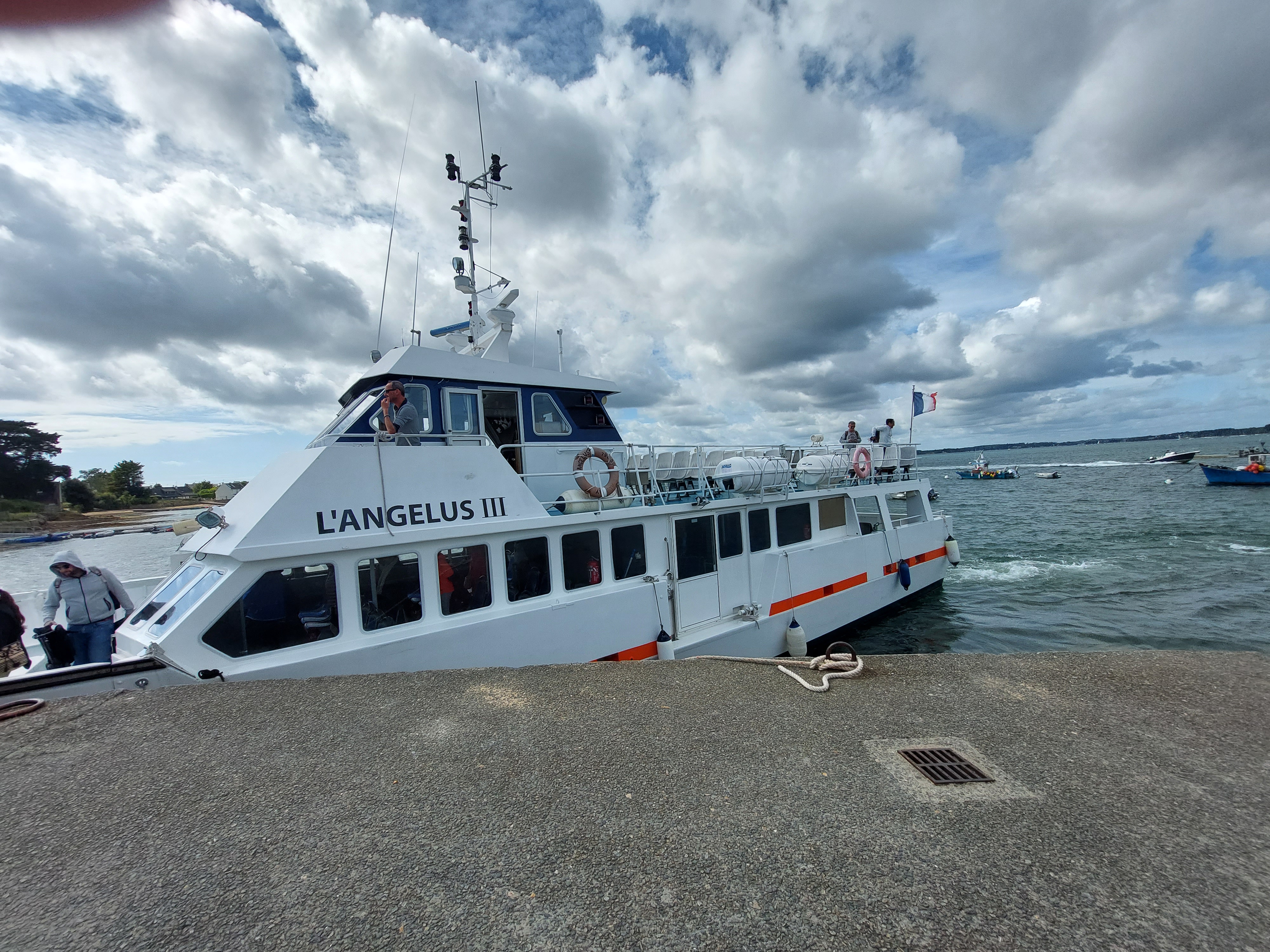Nous sommes montés à bord d'une vedette Angélus au départ de Port Navalo pour une très belle ballade sur la rivière d'Auray. Ce fut magnifique, et nous recommandons fortement cette croisière. Sur la route du retour, nous n'étions que deux à revenir à Port Navalo, les autres touristes poursuivant leur croisière dans le golfe. Le capitaine nous a demandé de descendre à Locqmariaquer, puis de prendre le petit bateau vert et noir derrière le navire (de la compagnie du Passeur des Îles) pour revenir à Port Navalo. Cette dernière compagnie n'avait, à notre surprise, pas été avertie, mais a eu la gentillesse de nous ramener à Port Navalo alors que nous n'avions pas de billets à leur nom. Nous comprenons qu'il y ait de la solidarité entre les différentes compagnies et cela est très positif, mais il est regrettable que la compagnie Angélus laisse ses clients livrés à eux mêmes sur le quai, sans même prendre la peine de prévenir les compagnies voisines, ni même de s'assurer que nous aurions des places disponibles sur le bateau pour notre retour. L'Angélus étant déjà reparti avant l'arrivée du Passeur des Îles, nous nous demandons encore ce que nous serions devenus si il n'y avait plus eu de places à bord de ce dernier ? La ballade fut belle avec la compagnie Angélus, mais avec un arrière goût amer. On ne laisse pas ses clients comme un chien dans un jeu de quille, c'est une question de respect ! Nous en profitons pour remercier la compagnie du Passeur des Îles qui organise par ailleurs de très belles croisières dans le Golfe du Morbihan que nous vous recommandons vivement.